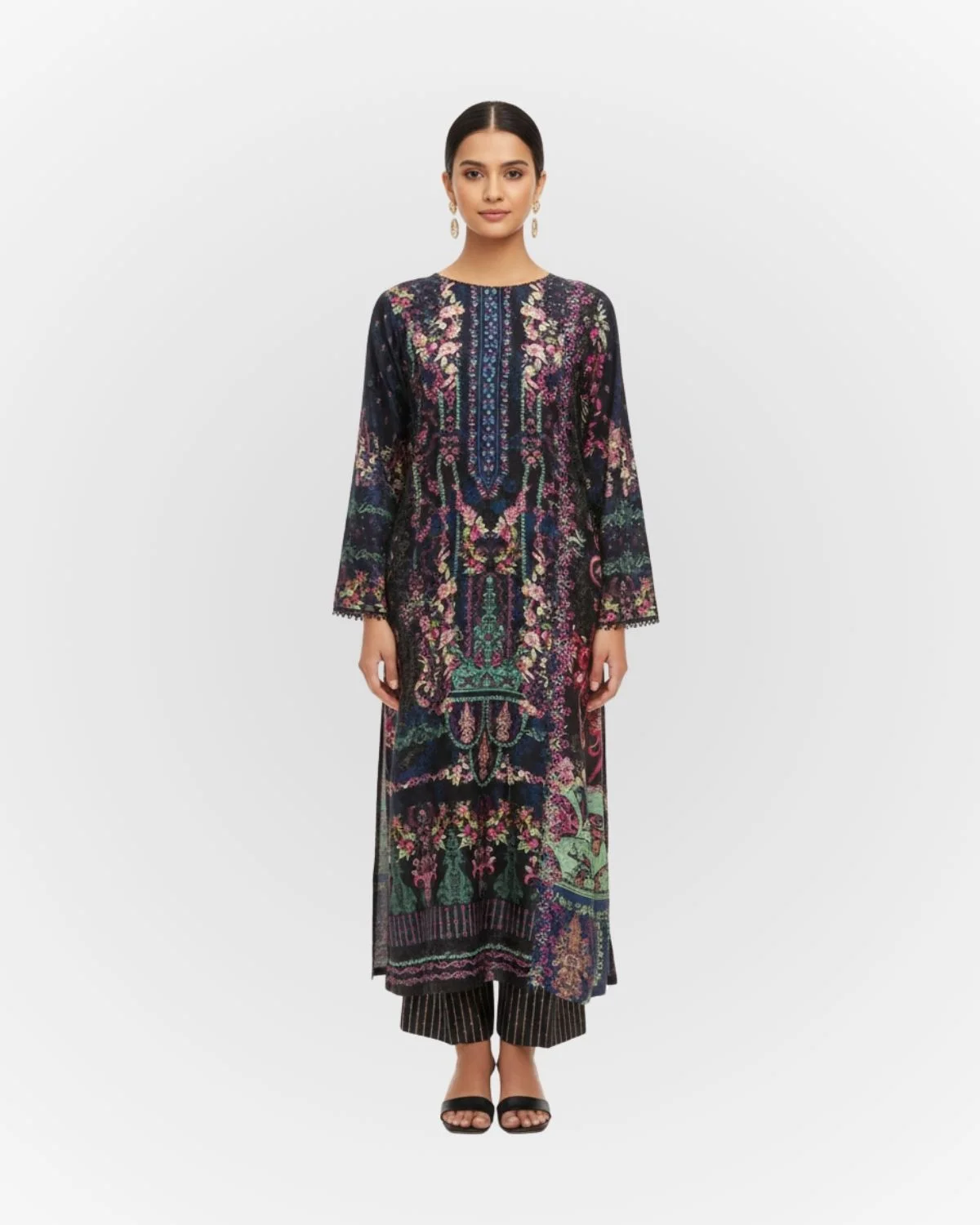 Front: Digital printed lawn embroidery neck.